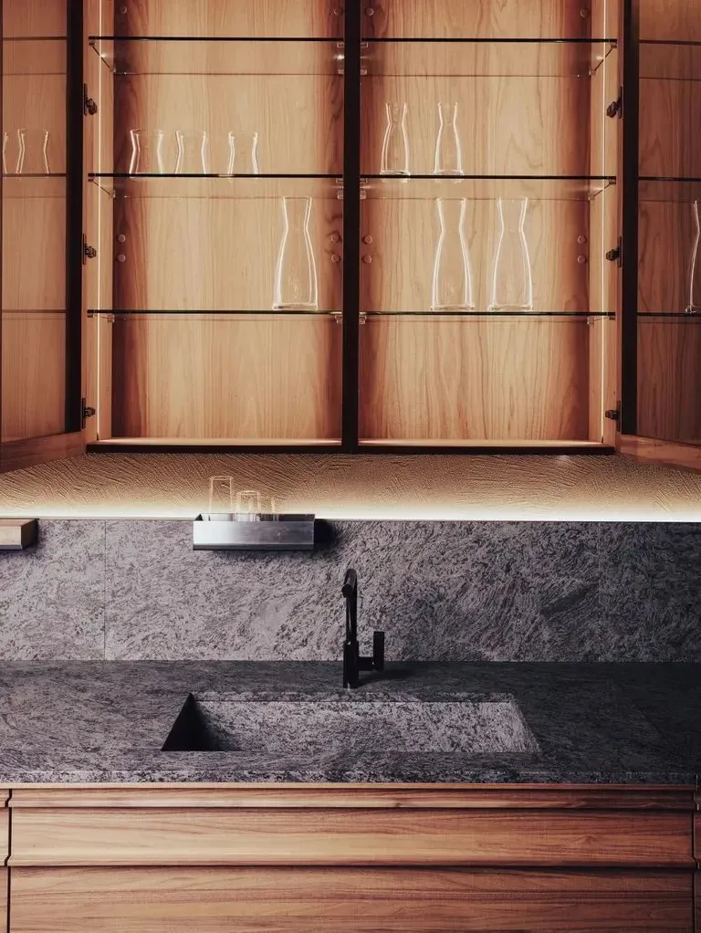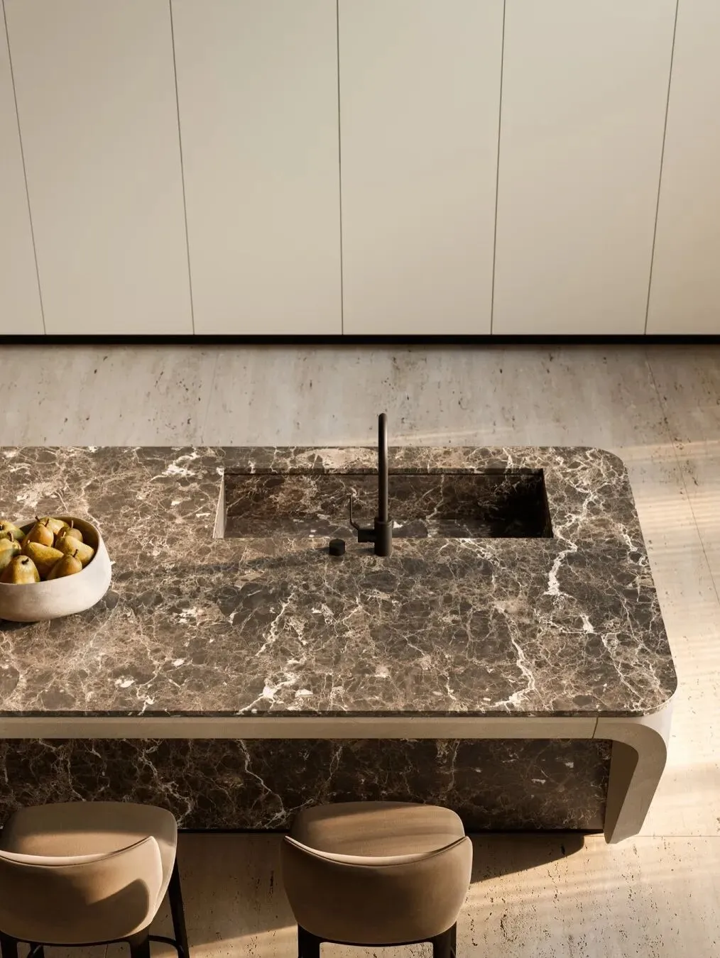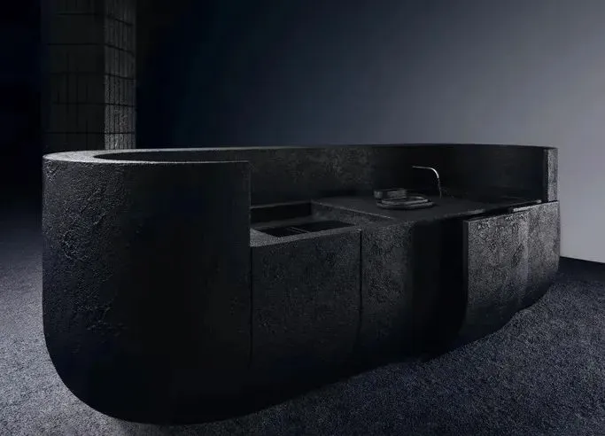 Henrytimi has been at the forefront of this movement, describing its collections as “practical works of art” and prioritizing natural materials like wood and stone to craft kitchens with geometric purity and minimalist beauty. The “Arca” series, made from black clay and Nero Fossil, features textured, curved cabinet doors that conceal a range of practical drawers, while the raised backsplash not only hides clutter but also doubles as a bar counter.