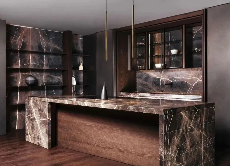 Take Modulnova Kitchen’s “Blade Lab,” designed by Carlo Presotto and Andrea Bassanello: This kitchen is the Italian company’s result of meticulous research into new materials and technologies, with countertops, cabinets, and backsplashes all crafted from thick slabs of Sahara Brown marble. Additionally, its 1.5cm-thick doors feature a hollowed-out design for lightweight ease of opening, paired with bronze-powder-coated glass and aluminum cabinets, while full-height bookcases act as a transitional element connecting to the living area.