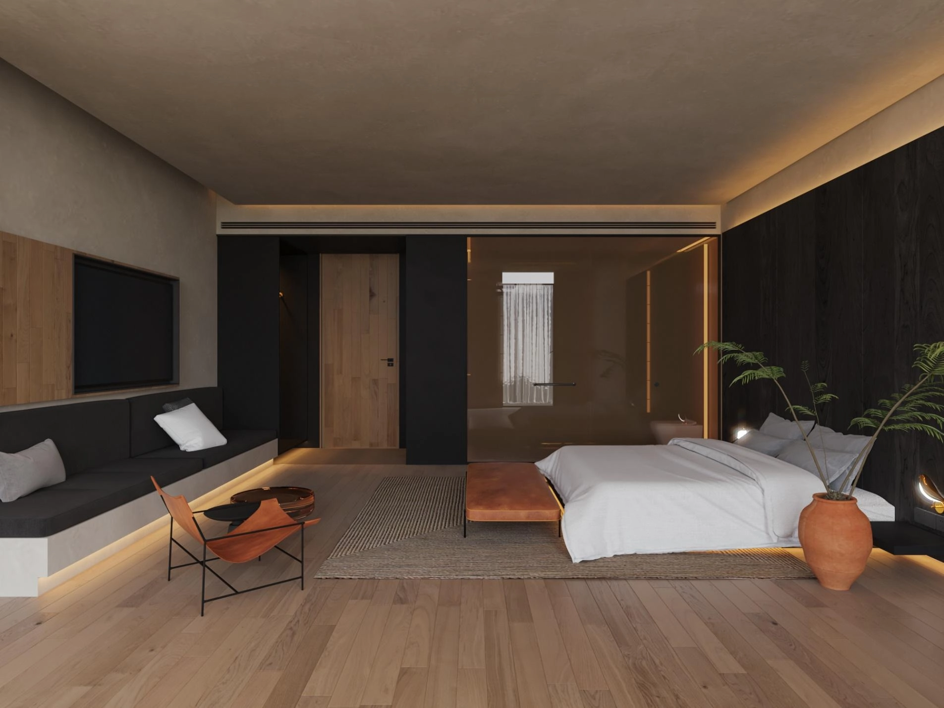 In the guestrooms, large windows soften the boundary between inside and out, while natural textures — linen, timber, clay — evoke a grounding warmth. The open wash area and minimalist furnishings reinforce the philosophy of honest material and human proportion.