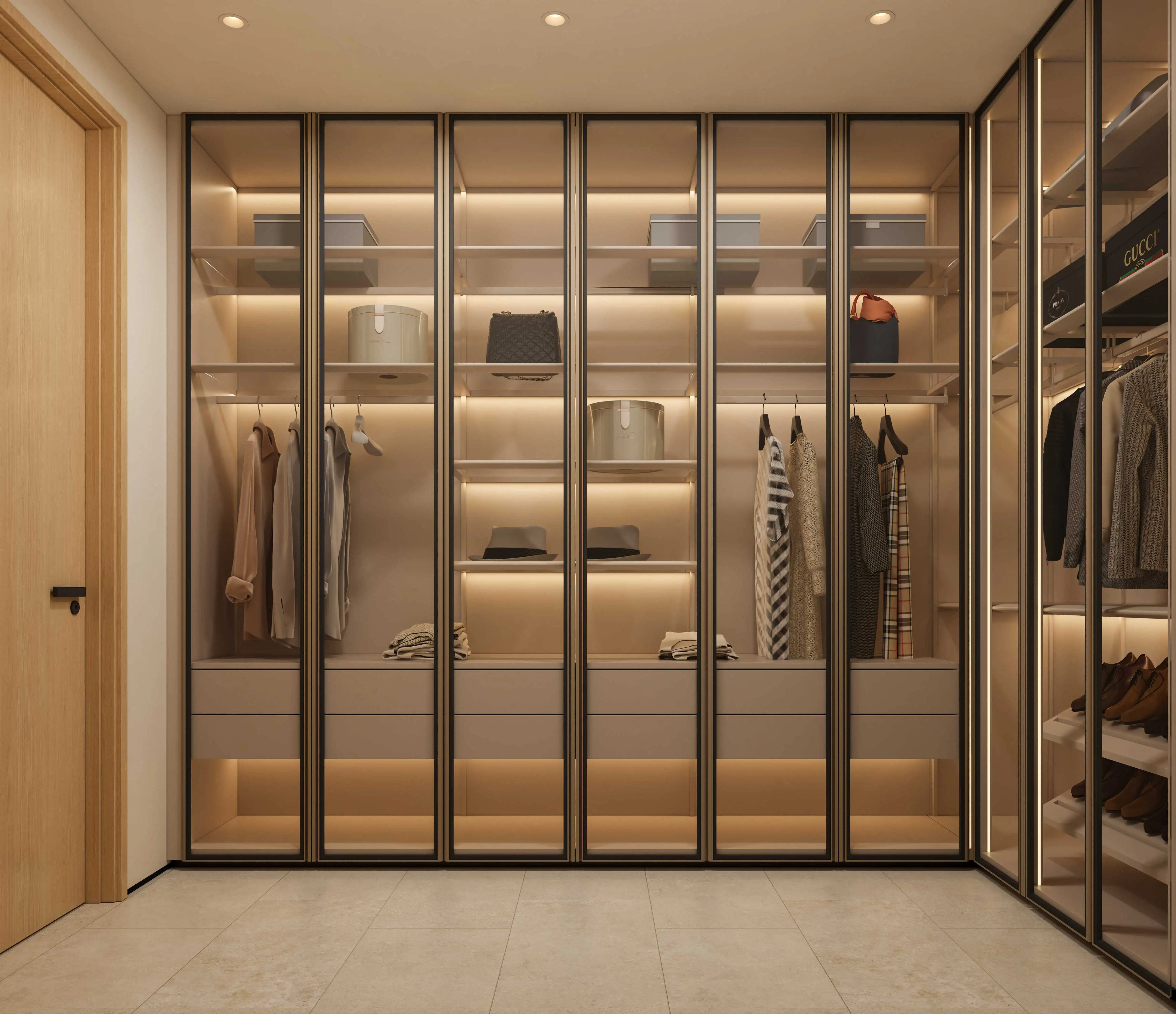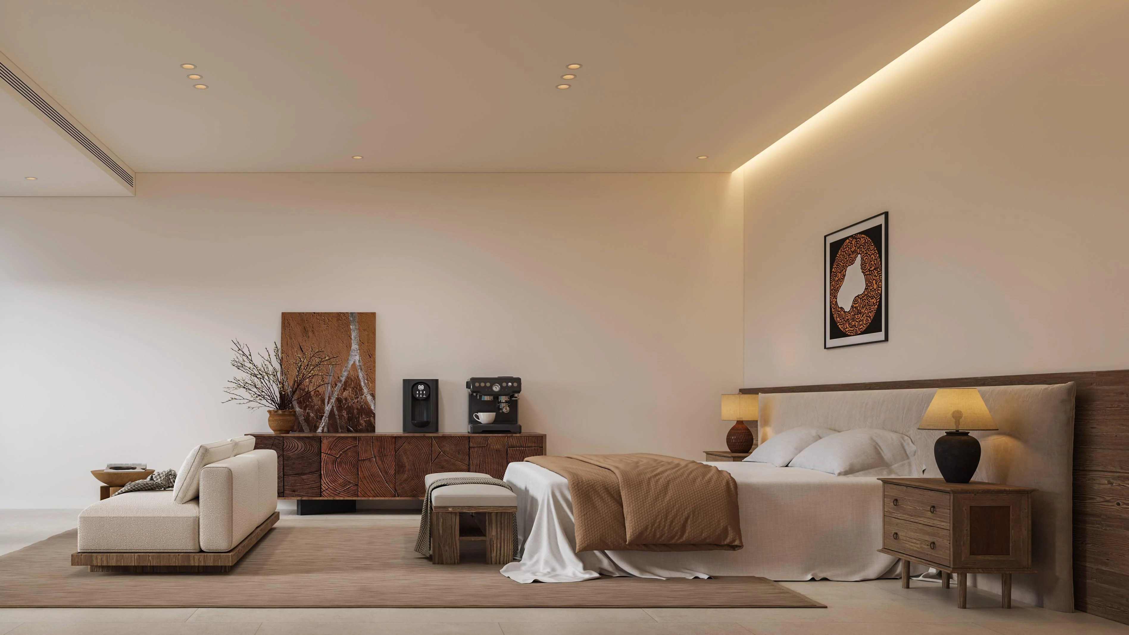Inside, every detail reflects quiet luxury — from the crafted wardrobe systems and softly illuminated textures to the tactile furniture that grounds the minimalist palette. The master suite opens directly to the sea, offering a peaceful dialogue between architecture and landscape.