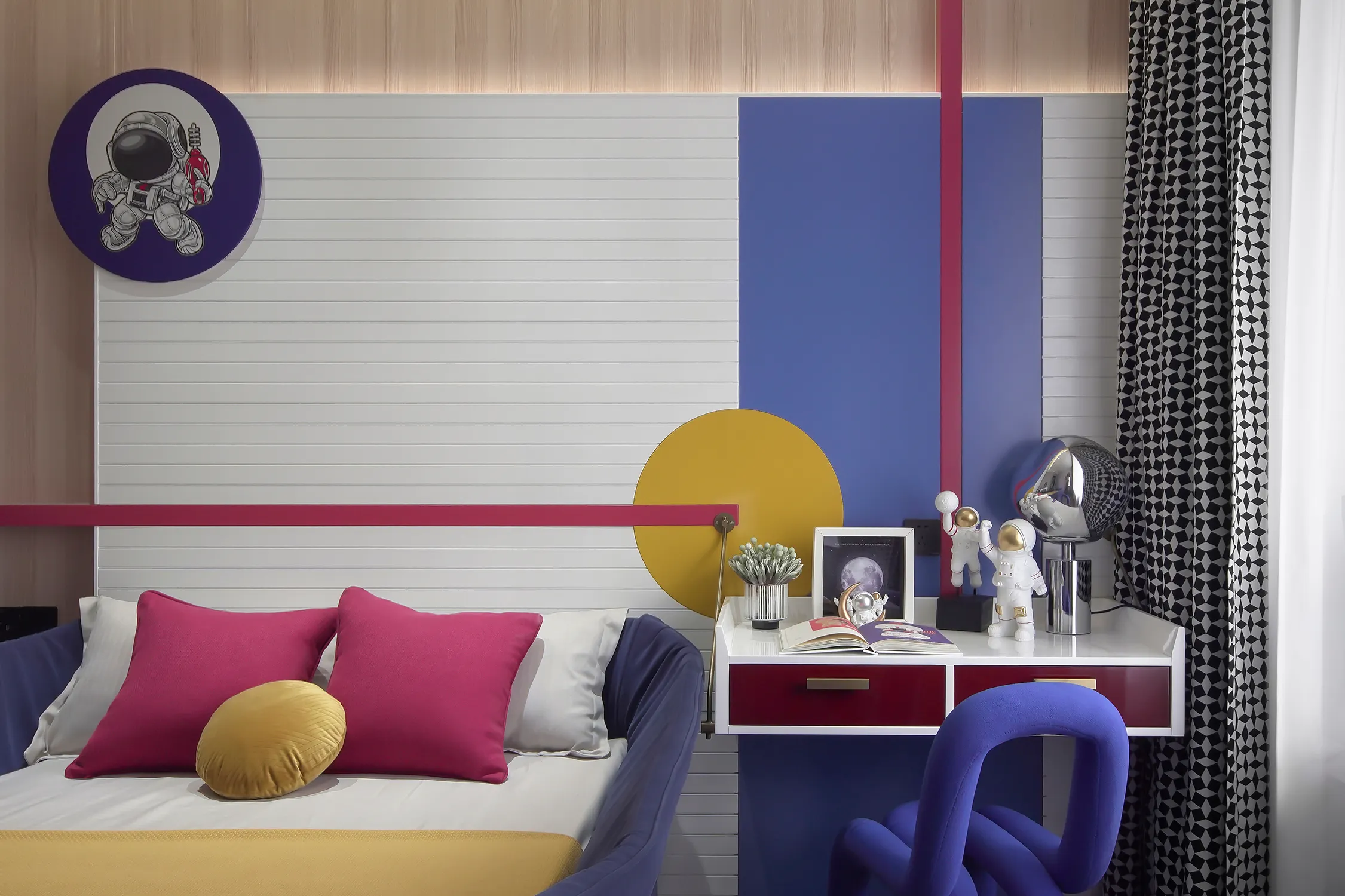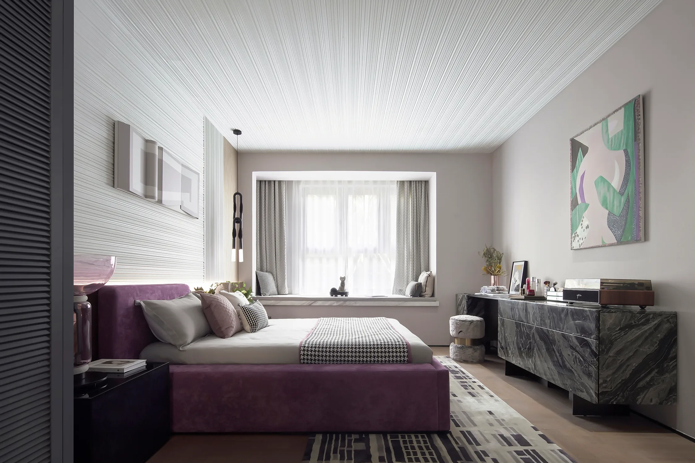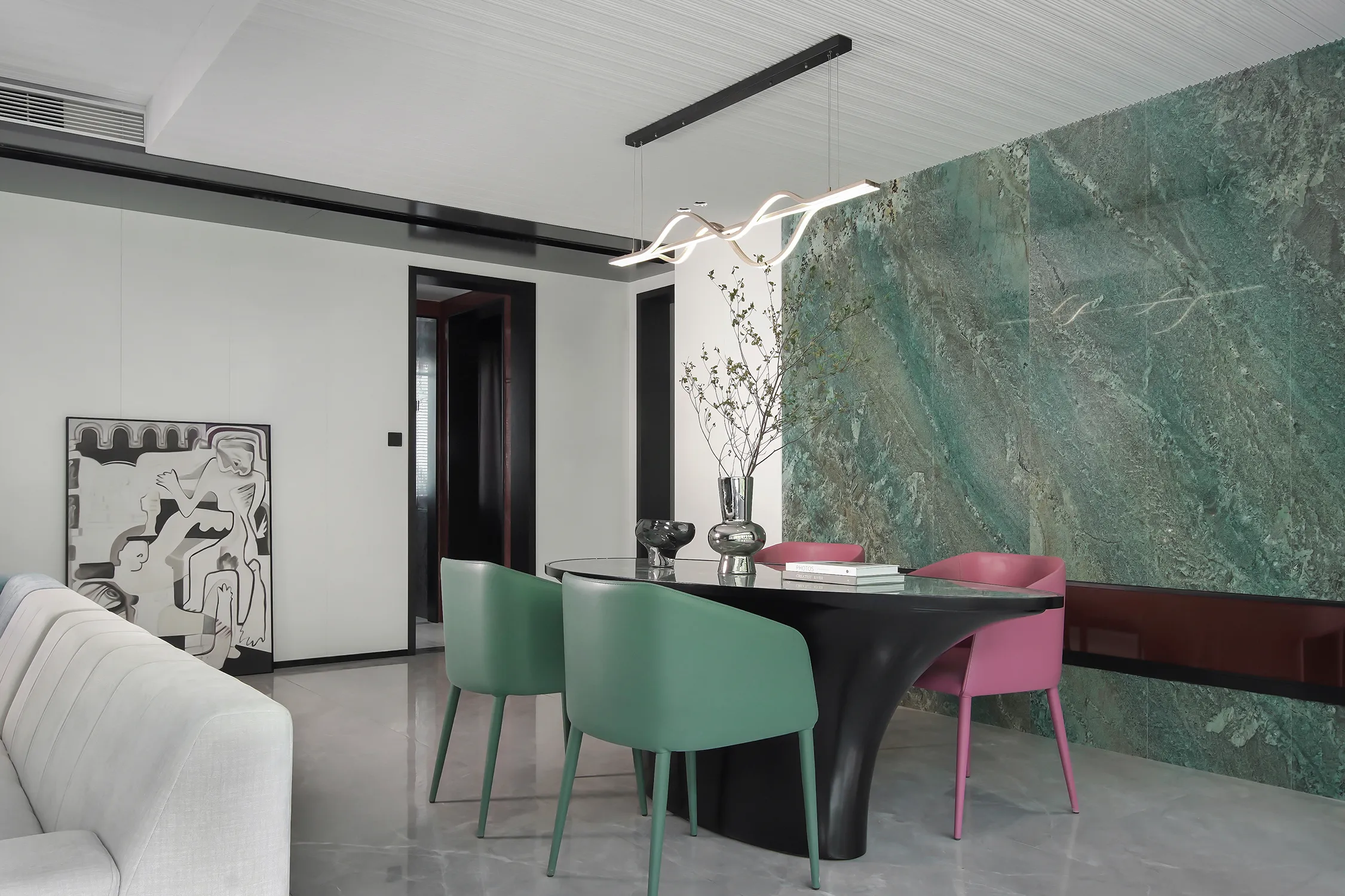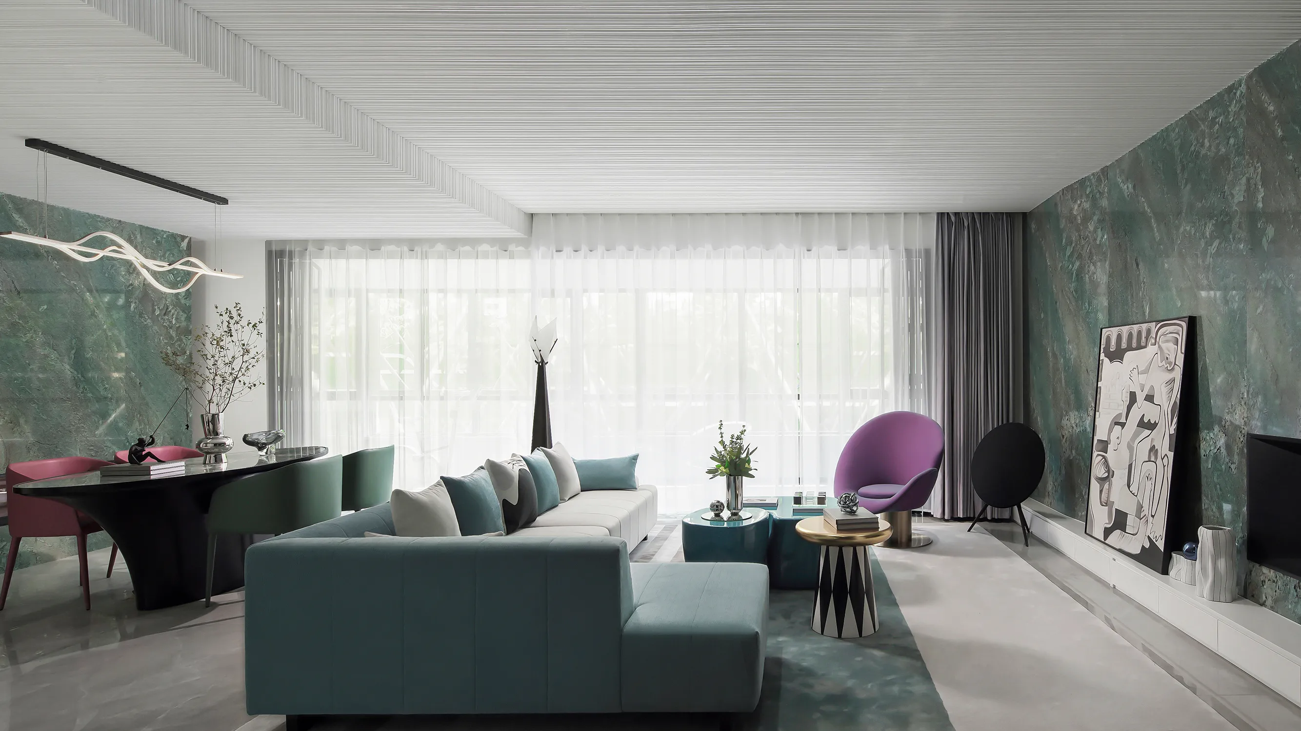 Nestled in the heart of Chuzhou, this showflat is a beacon of modern design. The living room's plush sofas and striking accent chairs invite relaxation, while the dining area's unique table set against a bold green marble wall makes a statement. The bedroom's luxurious purple bed and tasteful dresser offer a serene retreat. This space is not just a home; it's a testament to contemporary living, where every detail is crafted to perfection.