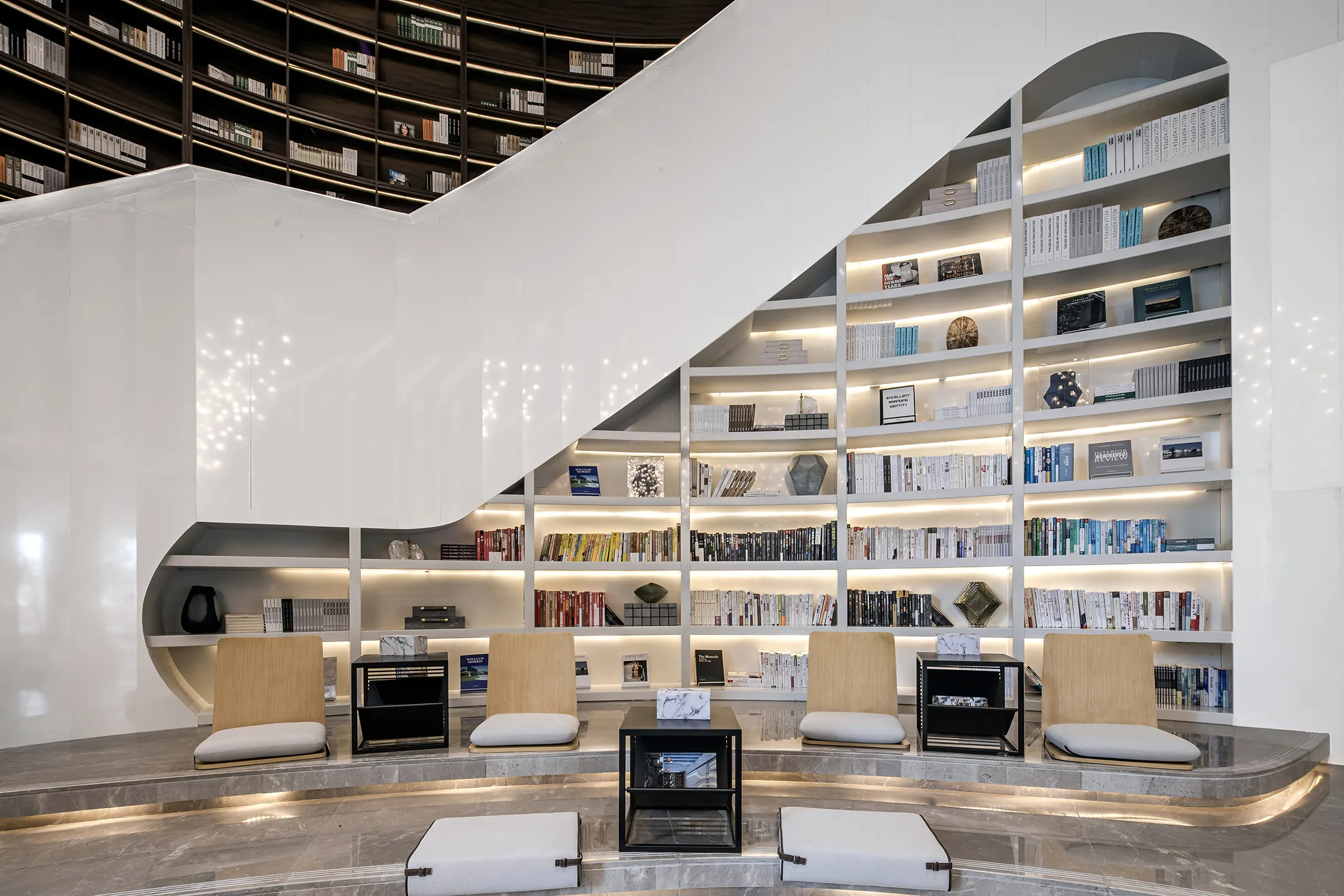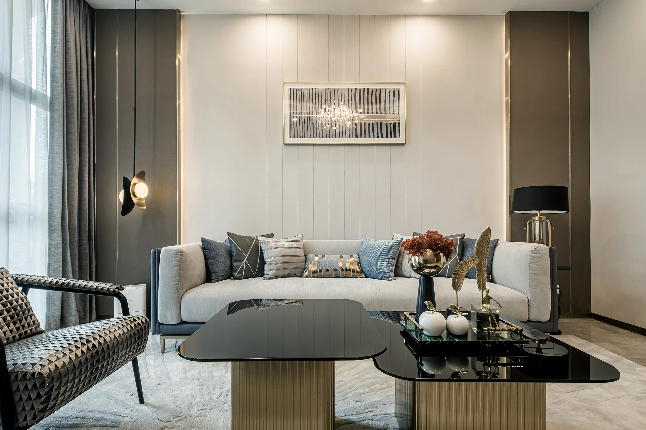 The design of Hesheng Yujingwan's marketing center integrates a modern minimalist style with oriental aesthetics, creating a professional and creative business environment. The open layout is equipped with high-end custom furniture and smart lighting systems, designed to enhance work efficiency and employee satisfaction. Additionally, the design incorporates natural elements such as greenery walls and natural light, adding a unique artistic touch to the marketing center. Featured soft decoration products include modern-style sofas, artistic lighting fixtures, and decorative greenery walls, which not only enhance the aesthetic appeal of the space but also reflect a modern luxurious style.