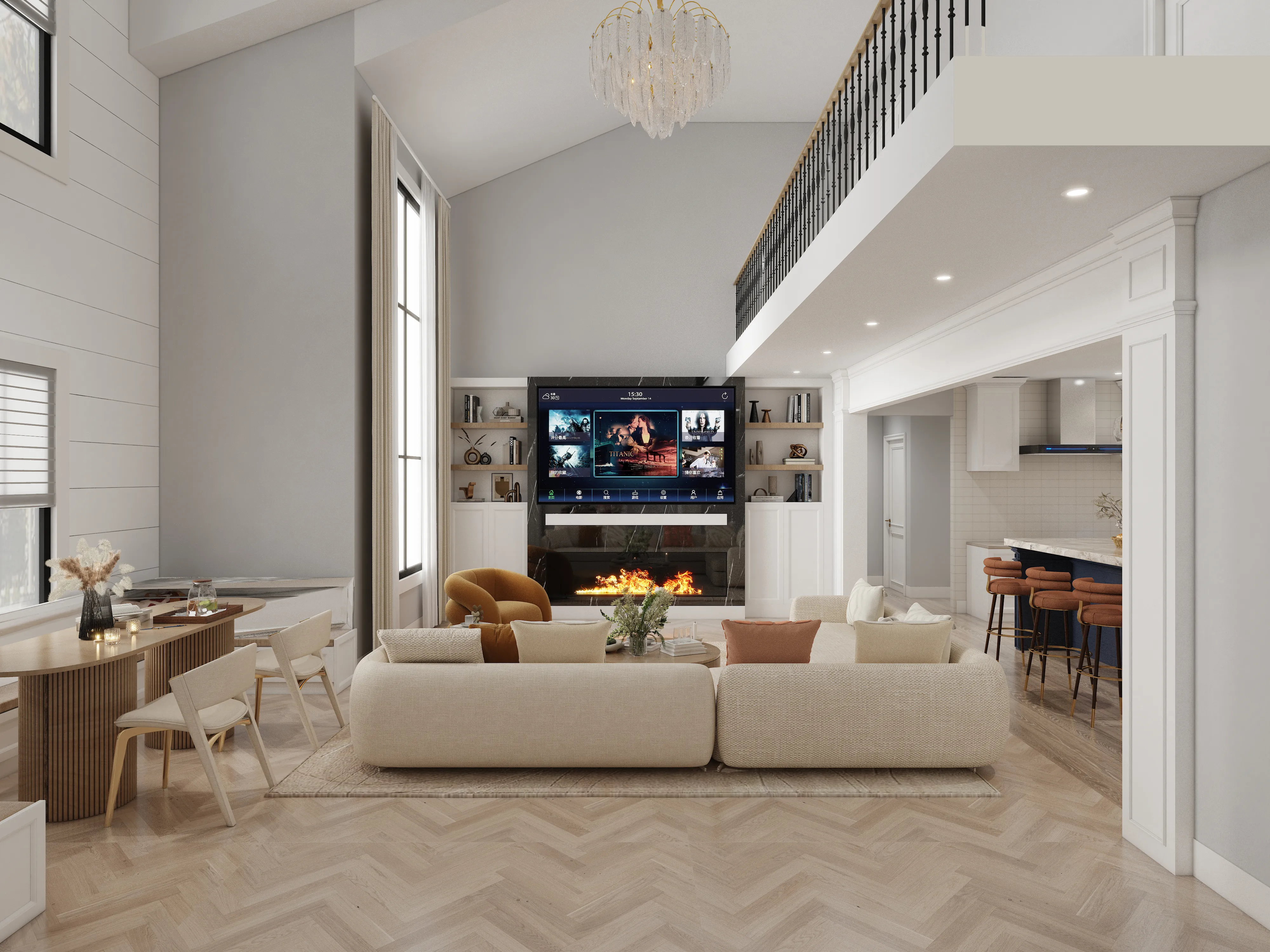 The main living area opens into a bright, double-height space with soft neutral furnishings and a seamless flow to the kitchen. The primary bedroom adopts a serene palette and gentle curves, while the dining room and home office emphasize warmth, clarity, and functional sophistication.