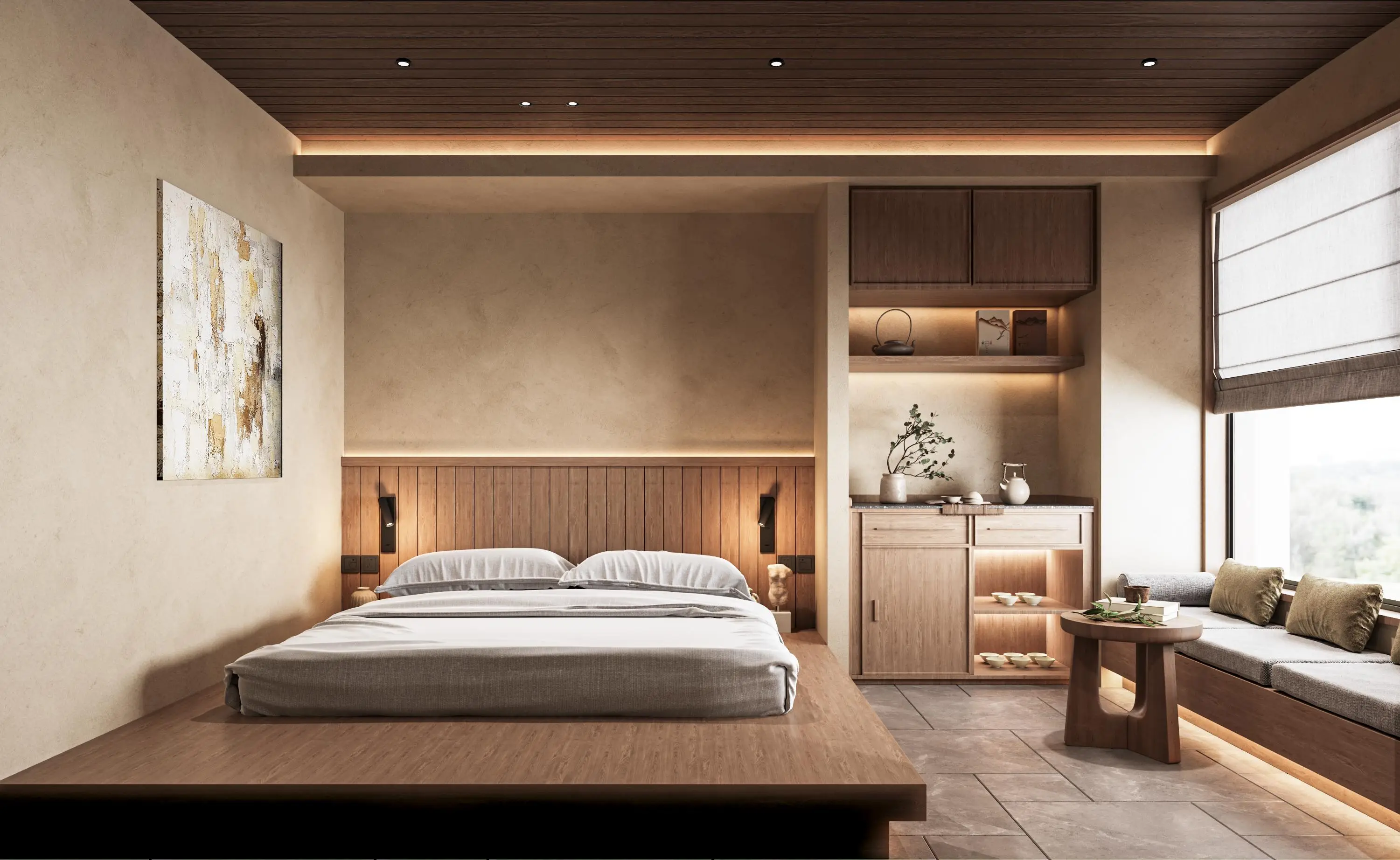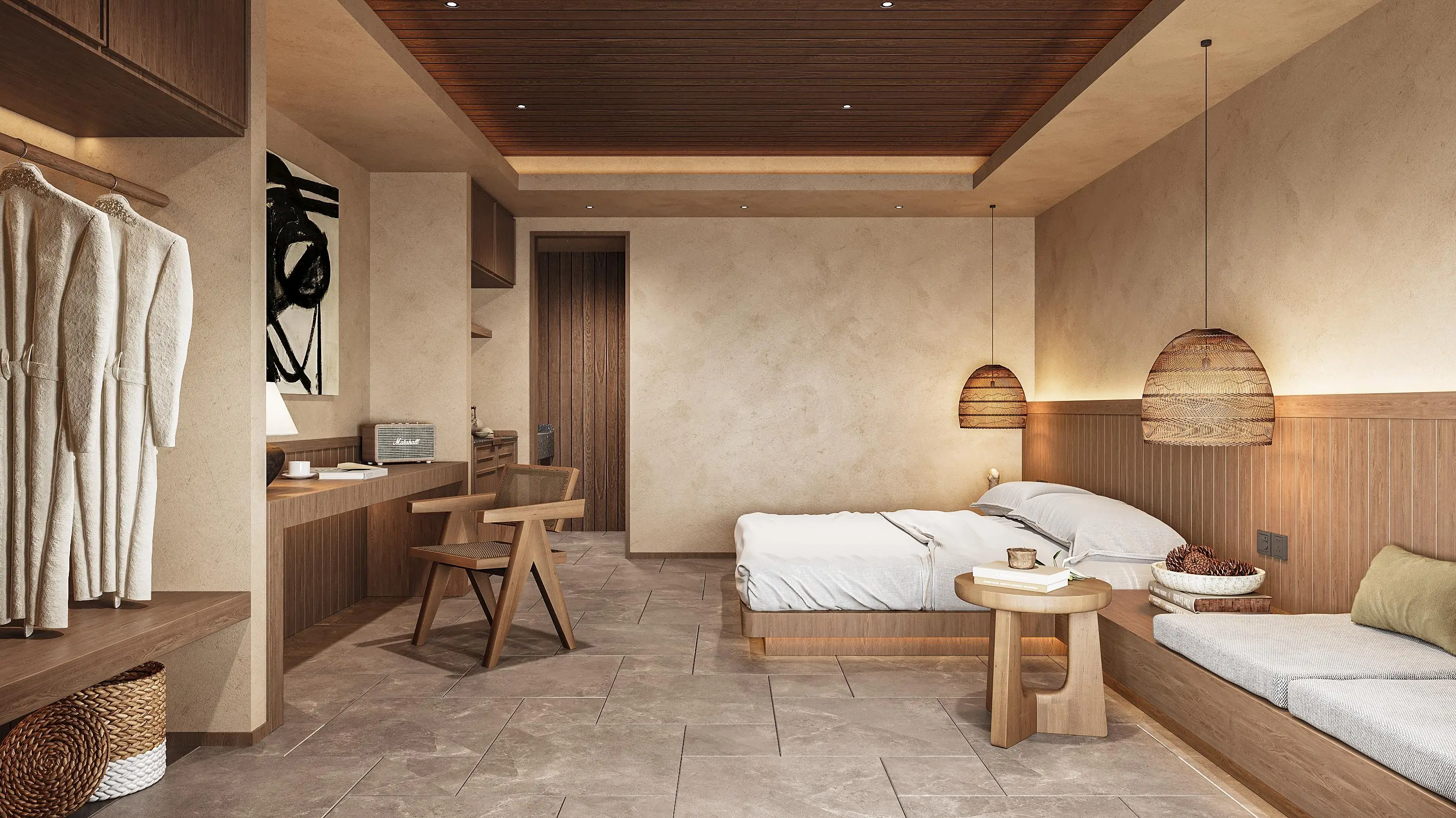 The architecture unfolds in sun-washed tones of ochre and sand, blending effortlessly with the steppe horizon. Interiors continue the dialogue through a palette of natural wood, woven textures, and soft stone. Each suite is designed as a cocoon of calm — where daylight diffuses across textured plaster, grounding guests in a meditative rhythm of stillness and simplicity.
