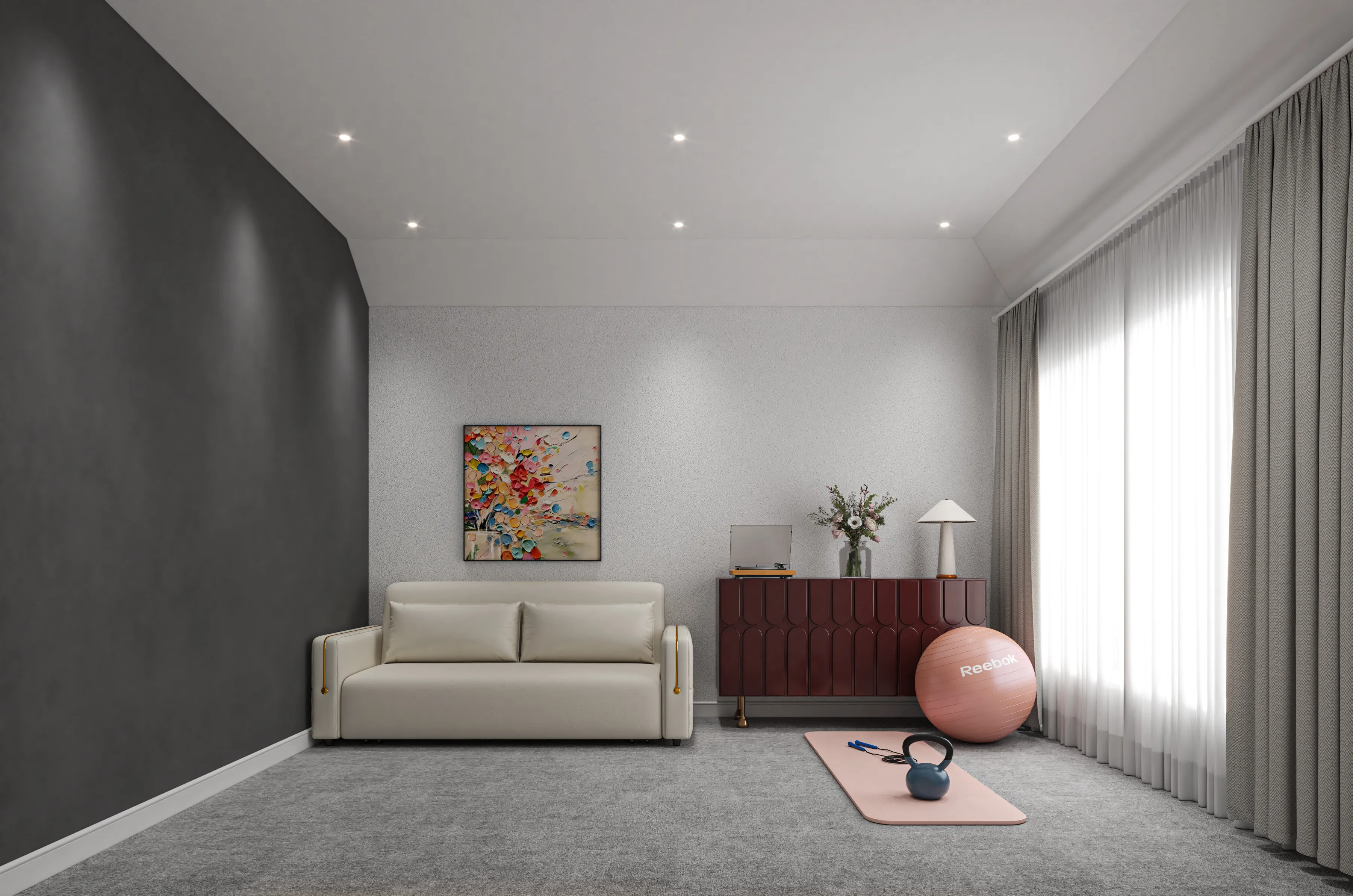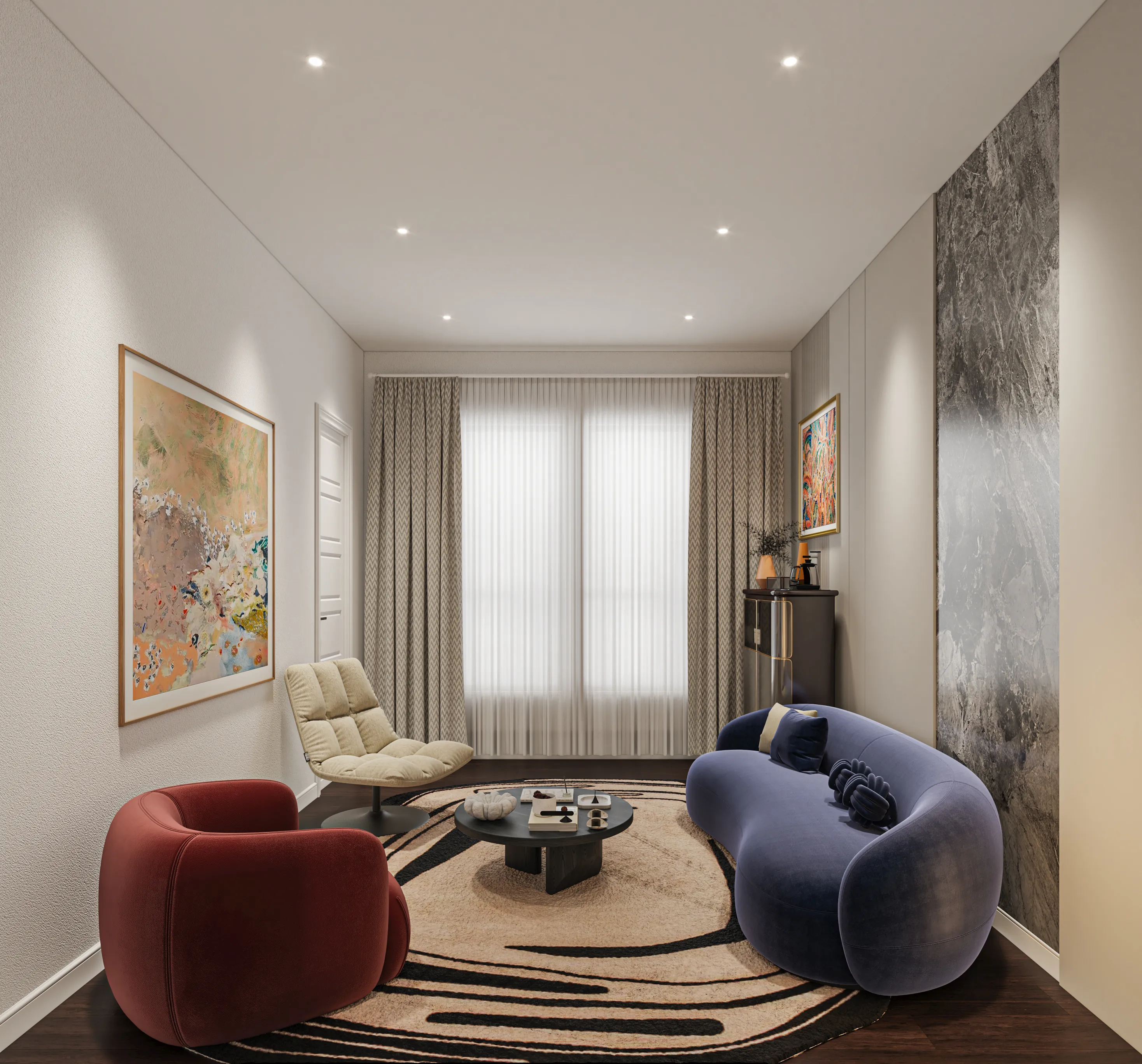 Large windows welcome abundant natural light, creating open, airy spaces that connect seamlessly with the rhythmic flow of the interiors. Through curated furnishings, art, and playful color accents, the home achieves a harmonious balance between sophistication and comfort—tailored for modern family living.