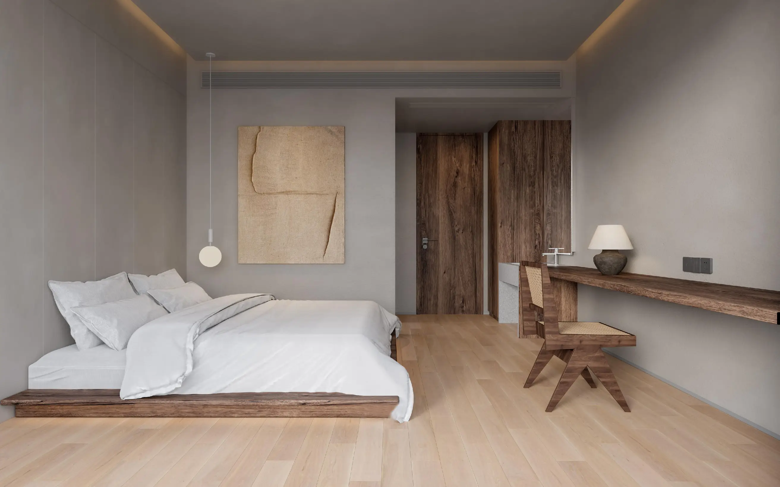 The design adopts a restrained palette of clay-toned plaster, oiled wood, and raw textures, forming a serene dialogue between architecture and the surrounding woodland. Large openings frame the soft greenery beyond, while the interior dissolves into contemplative spatial sequences defined by tactility and balance.