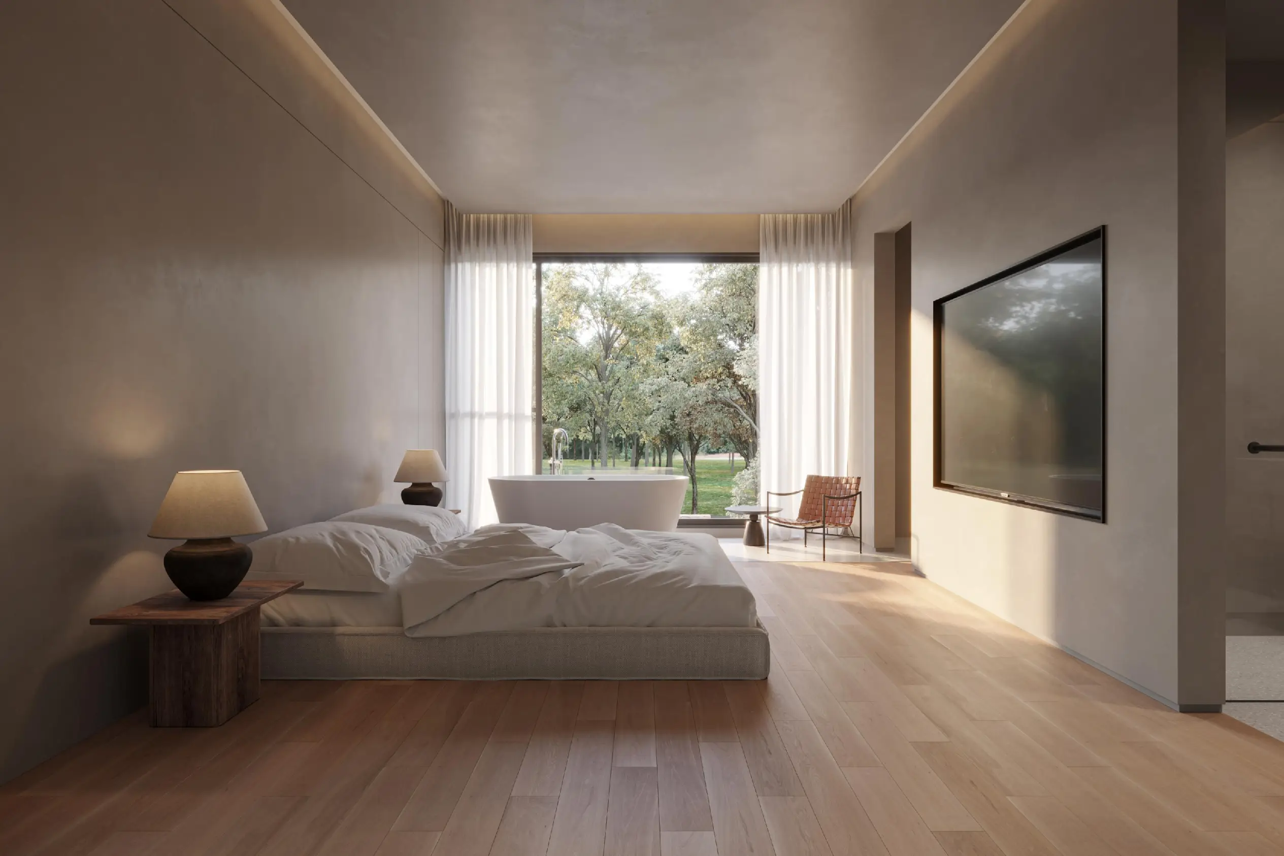 Furniture pieces are bespoke and sparse — hand-crafted timber, woven fibers, and ceramic details evoke a lived-in simplicity. In the guest rooms, the boundary between inside and outside blurs: a freestanding tub by the window invites immersion into landscape and time alike.