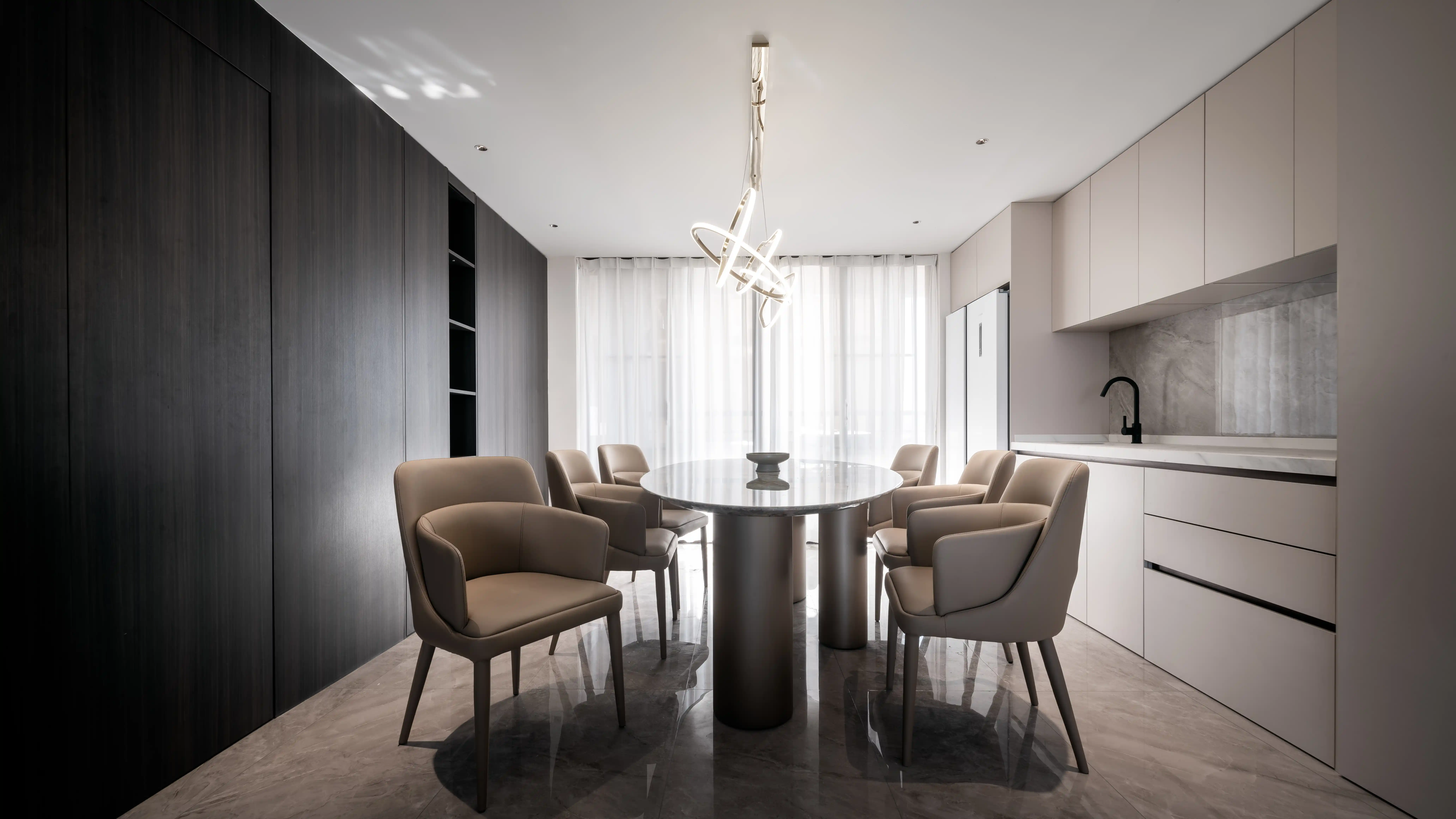 The living room centers around a textured marble wall that anchors the minimalist composition, complemented by soft ivory upholstery and sculptural furniture. The dining area continues this visual rhythm, defined by symmetry and material continuity, while the kitchen introduces functional elegance through integrated cabinetry and seamless surfaces.
