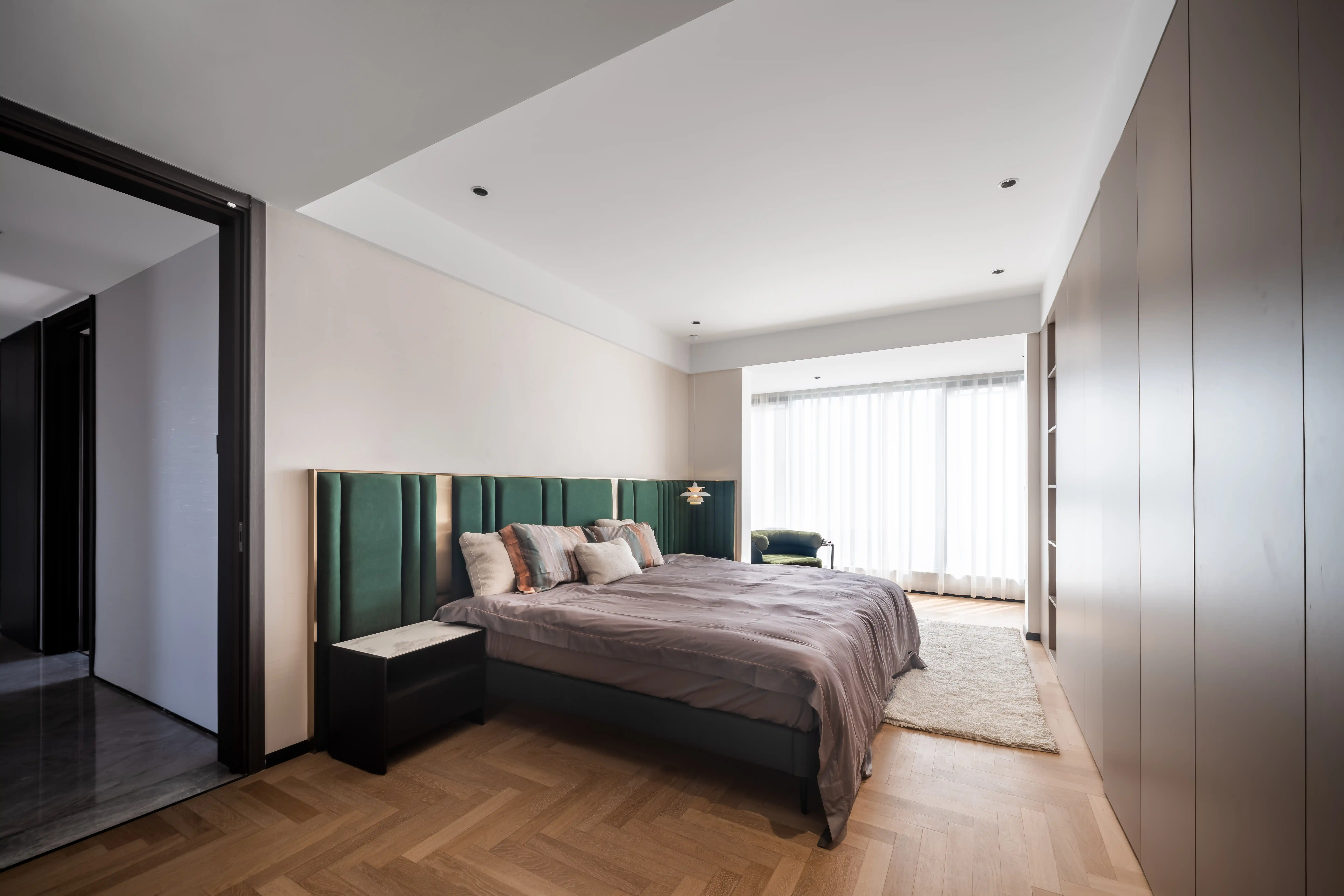 The master suite reveals a warm, tranquil retreat — with a velvety green headboard adding depth to the neutral palette and sunlight filtering gently through sheer curtains. Every space is choreographed to enhance calm, rhythm, and spatial clarity.