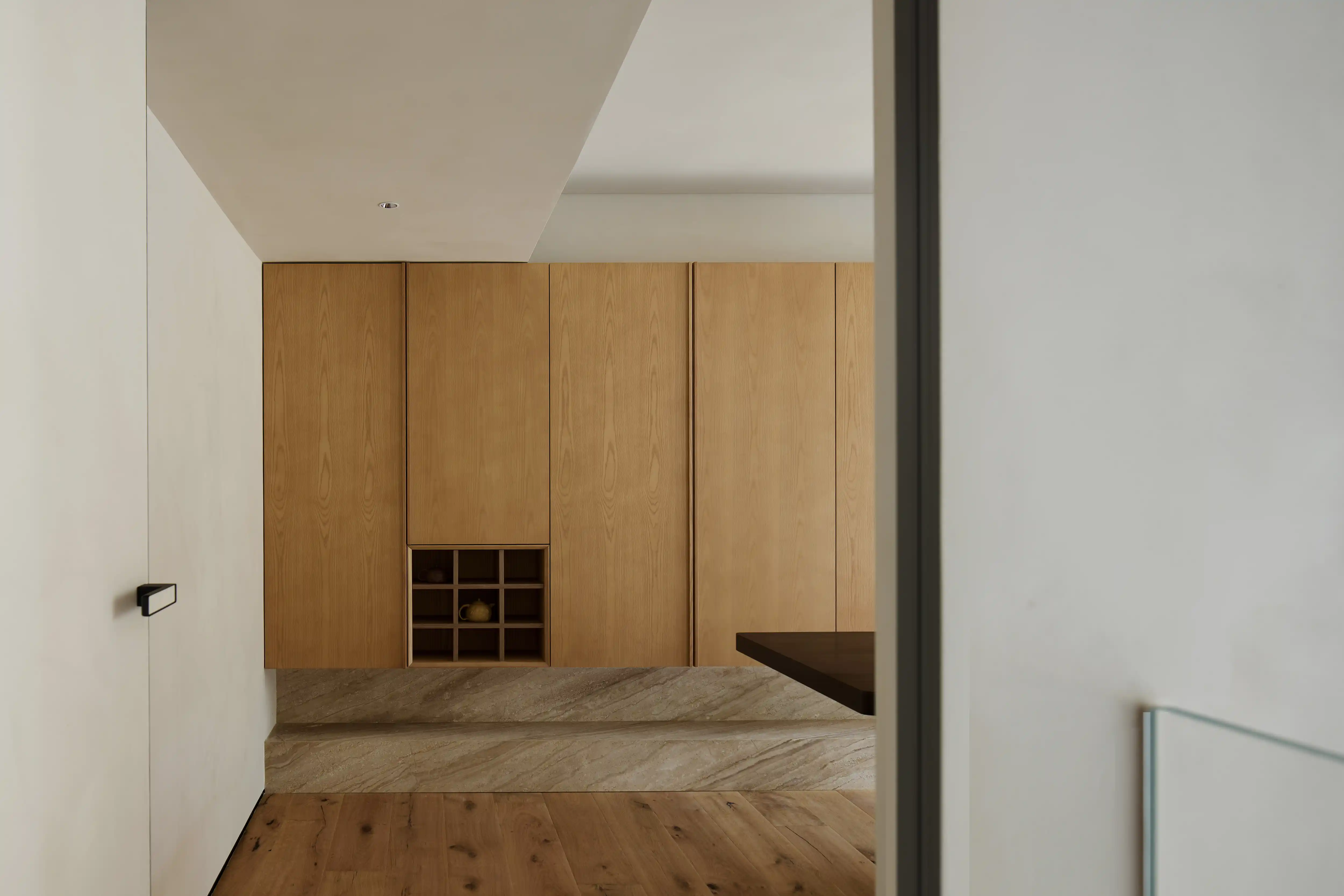 Soft Boundaries reinterprets urban living through a lens of warmth and restraint. The residence blends neutral tones, natural textures, and measured spatial rhythms to create an environment that feels timeless yet intimately human. Each surface — from the travertine stone island to the oak-paneled walls — is curated to capture and diffuse light with subtle precision.