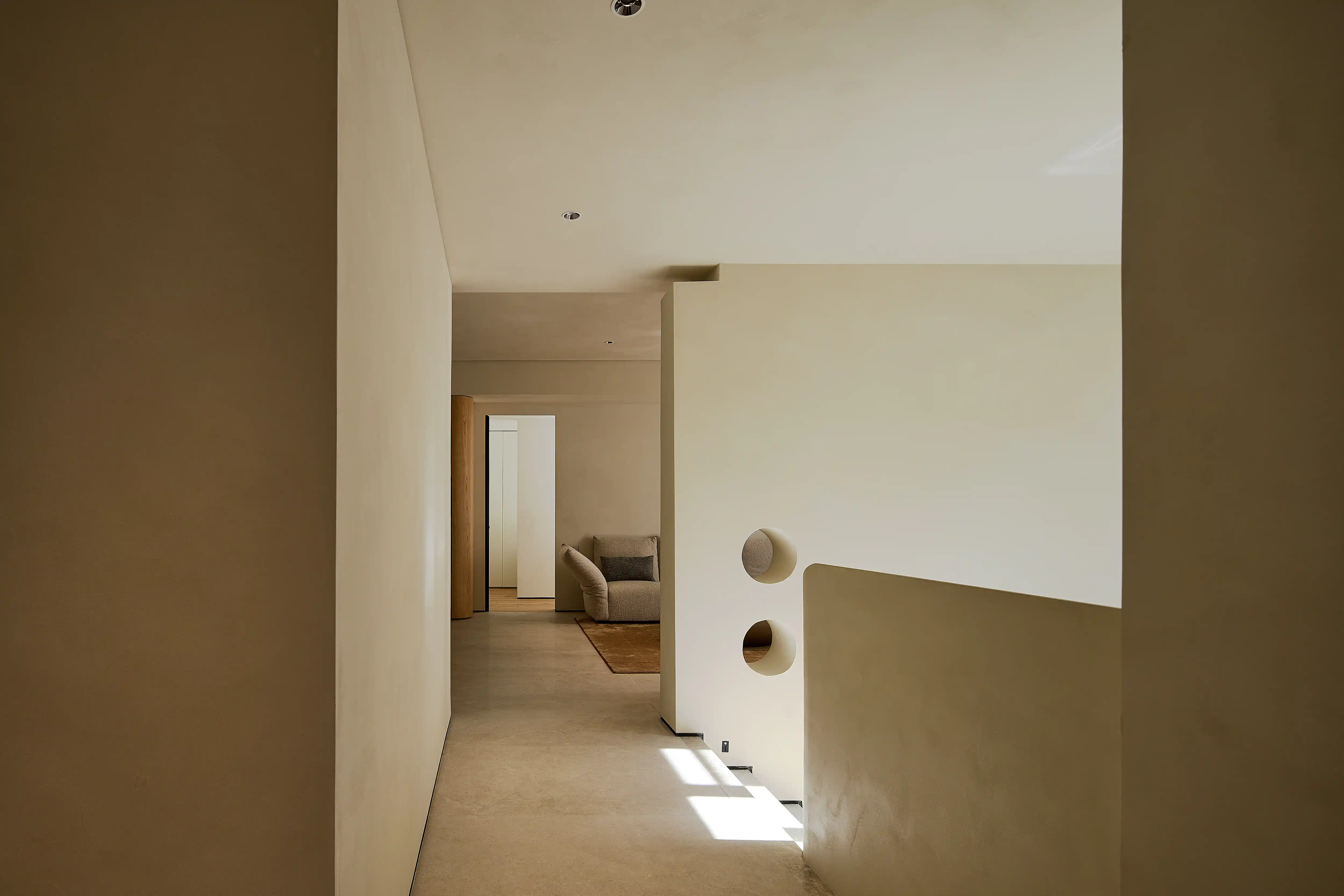 The open-plan layout encourages flow between living, dining, and workspace areas, allowing light to sculpt the atmosphere throughout the day. Gentle curves soften the geometry of the interior, while handcrafted furniture and tactile materials elevate everyday living into a sensory experience.