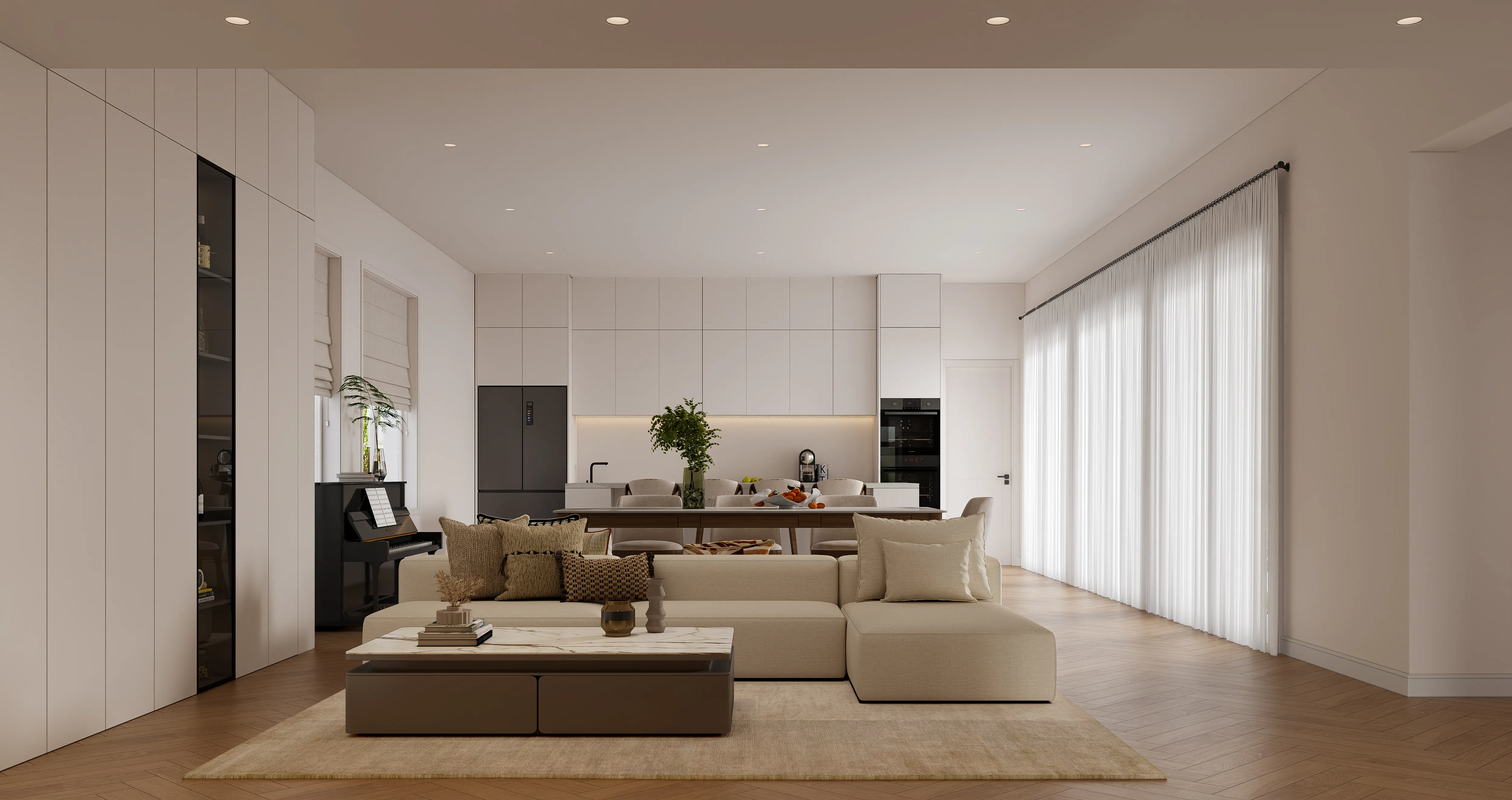 This Sydney villa embodies a serene, modern lifestyle shaped by clarity, function, and a refined palette. The interior architecture pairs clean lines with warm timber herringbone floors, creating a calm rhythm that flows seamlessly through the home. Soft beige walls, integrated cabinetry, and expansive glazing work together to amplify natural light, giving each space an airy and welcoming character.