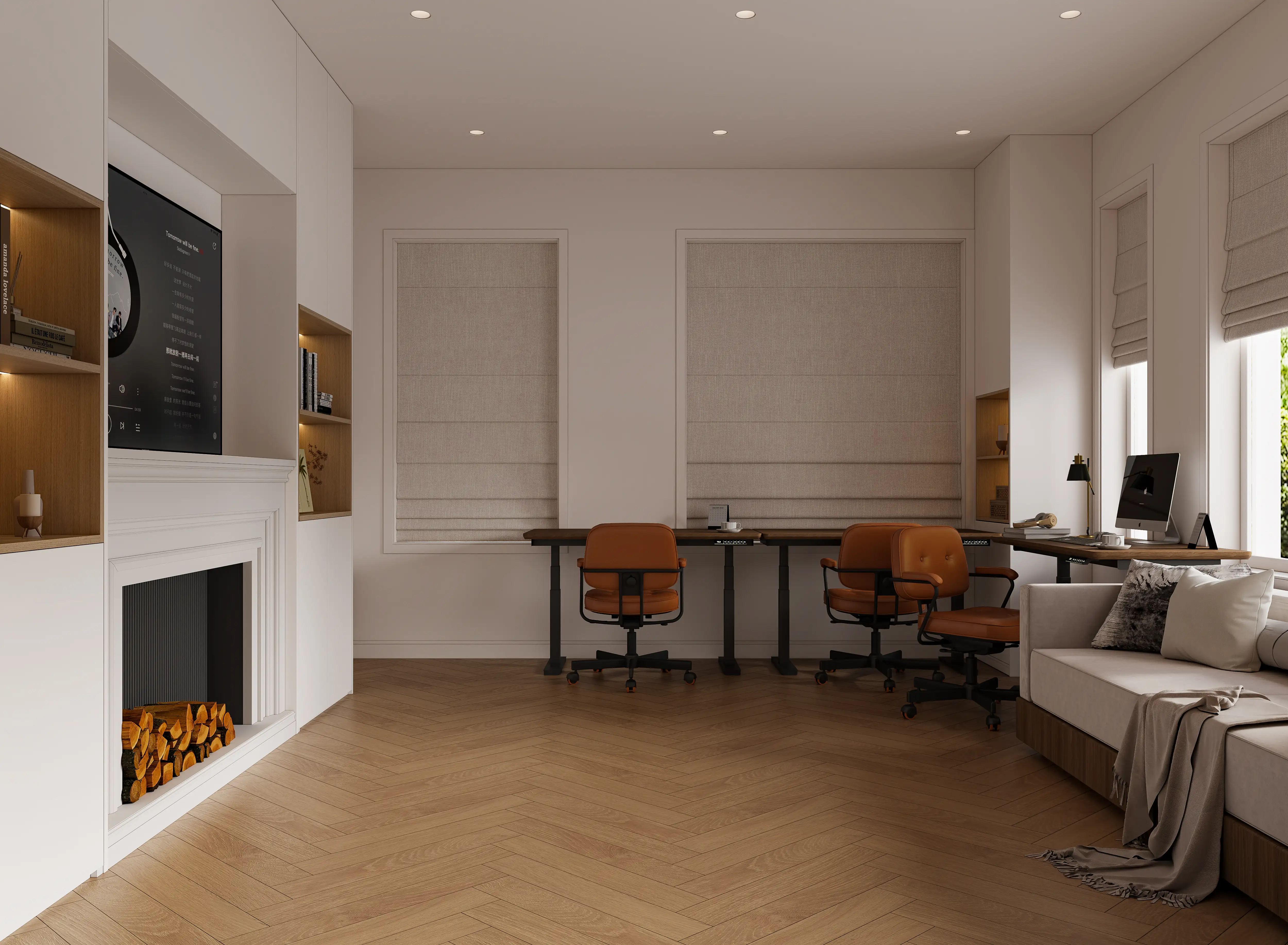 The living, dining, and kitchen areas form a single open-concept social core where daily rituals and family gatherings unfold. Custom millwork anchors the kitchen with generous storage, while subtle lighting accents reveal the craftsmanship of every detail. The study space is designed for dual productivity, featuring adjustable desks, warm leather seating, and built-in shelving around a central fireplace.