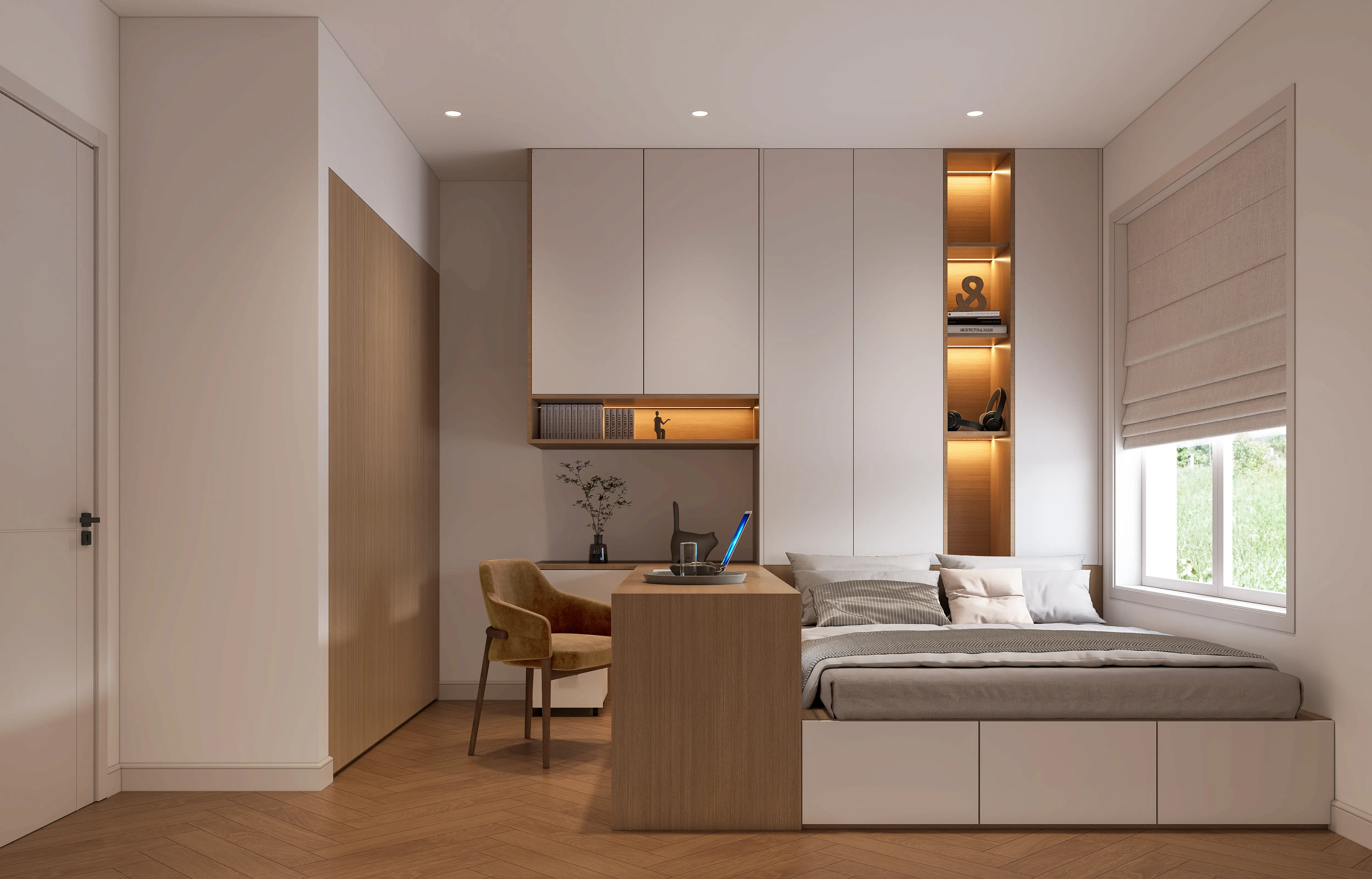 Bedrooms emphasize tranquility and comfort through tailored storage solutions, upholstered headboards, and ambient lighting that echoes the softness of the architectural language. Children’s rooms integrate playful functionality—raised beds, study zones, and warm wood-toned shelving—to support growth and creativity.