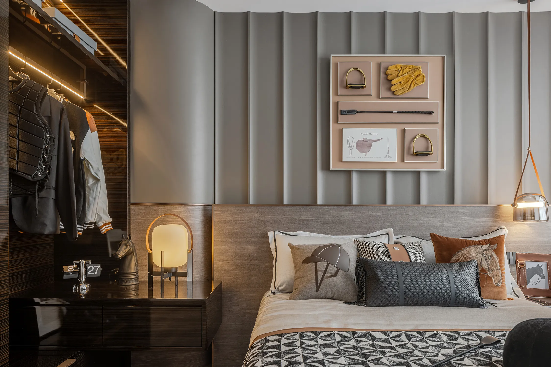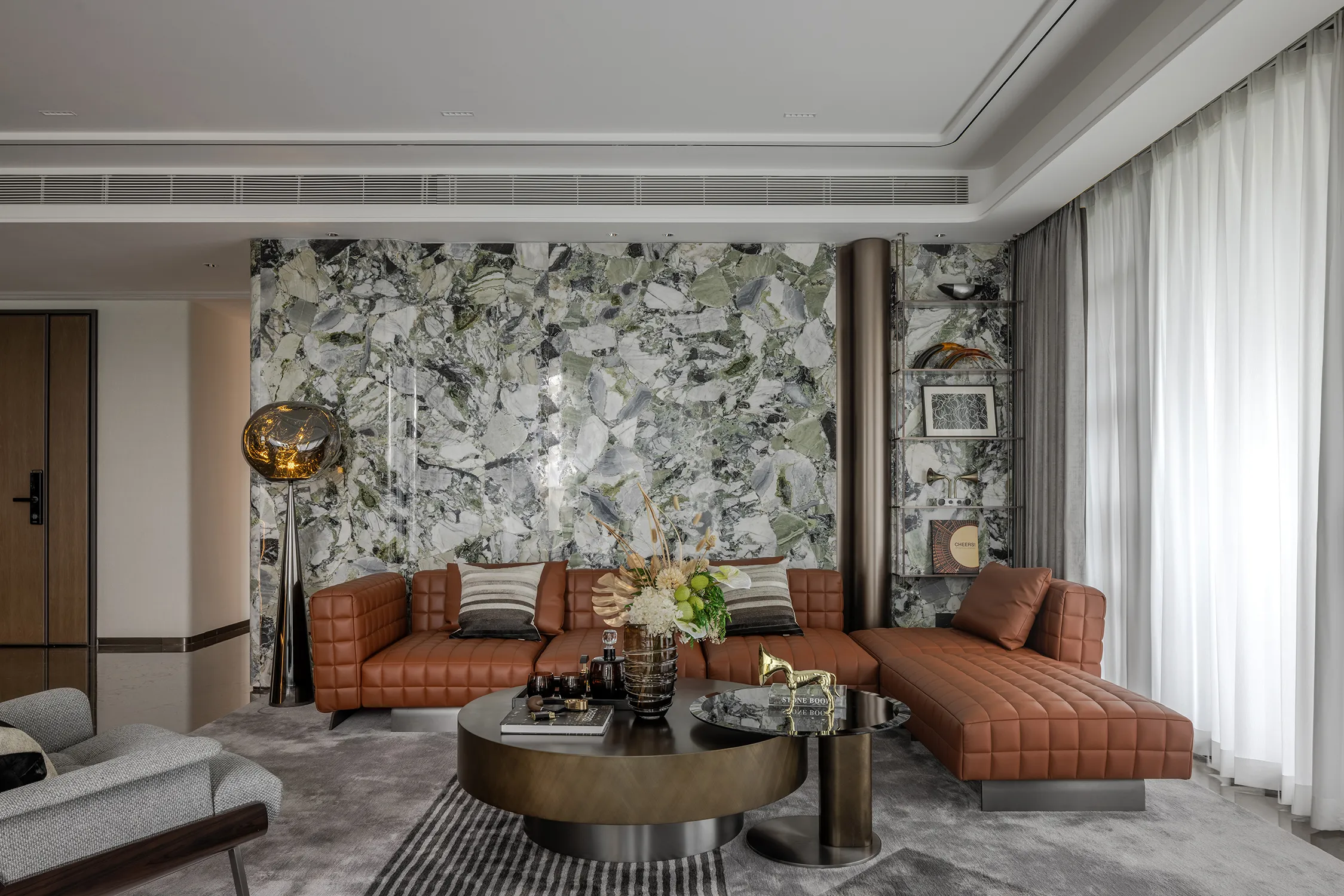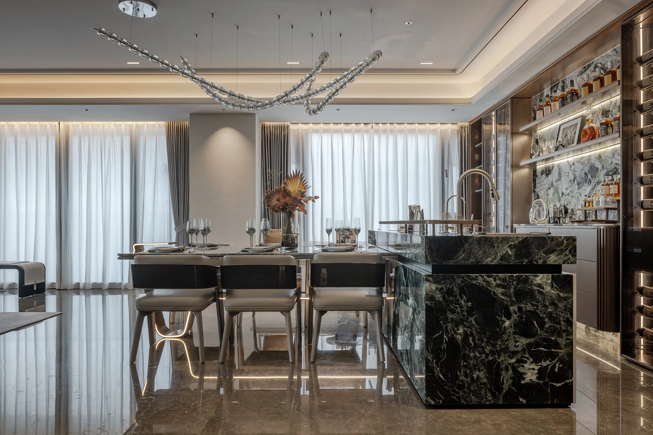 The Tian'ao Showflat in Huizhou showcases a perfect blend of contemporary design and luxurious living. The living room, characterized by its high ceilings and sophisticated marble walls, is a statement of modern elegance. The dining area, with its sleek glass table and an elegant chandelier, radiates refined luxury. The bedroom provides a serene sanctuary with a plush bed and a stylish nightstand, complemented by a large window that offers breathtaking city views. This showflat is not just a home; it's a masterpiece of modern living, where every detail is meticulously crafted.