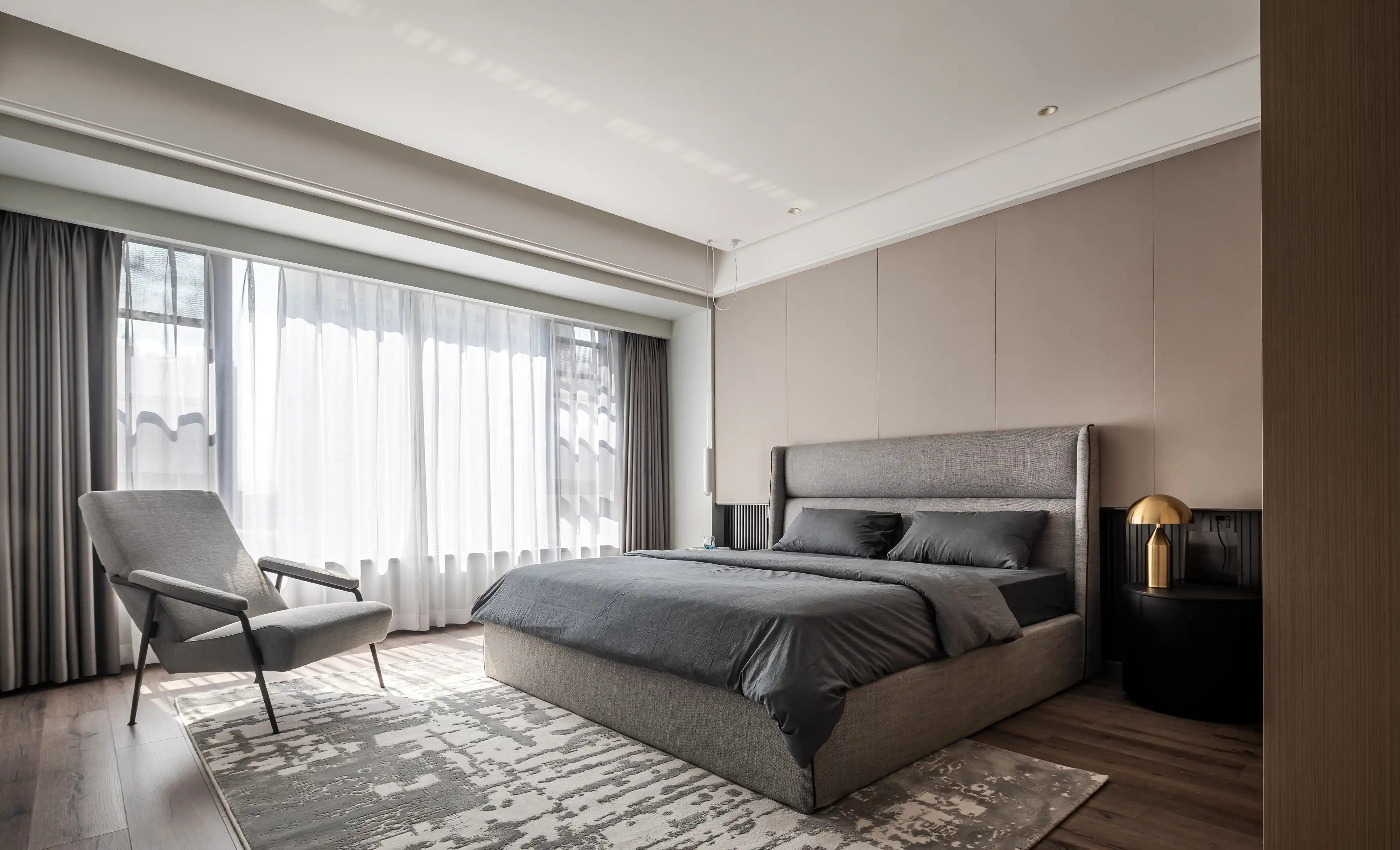 Warm oak tones, stone textures, and soft fabrics create a grounded palette that evokes a sense of composure and comfort. The design layers simplicity and craftsmanship—each piece of furniture, each wall treatment, and each lighting gesture contributes to a seamless narrative of understated luxury.